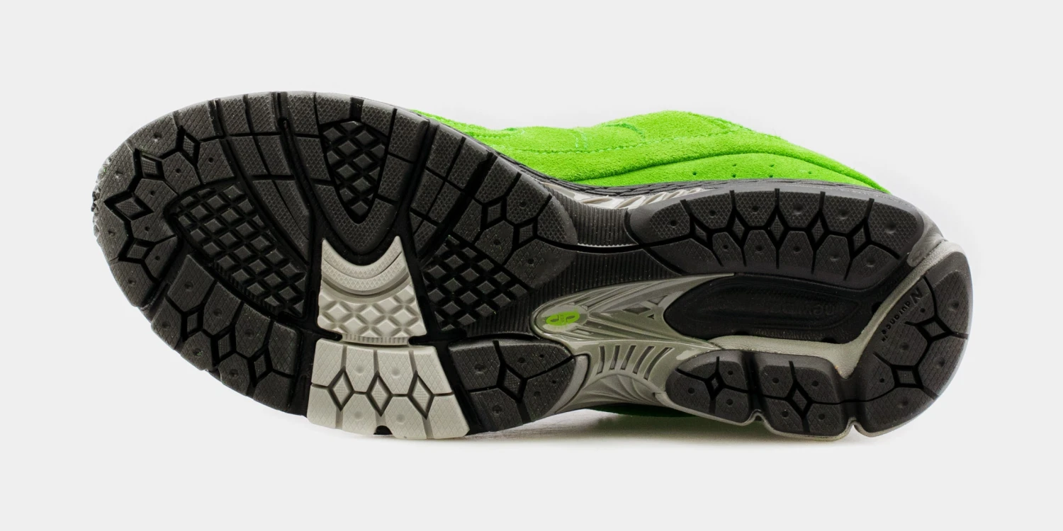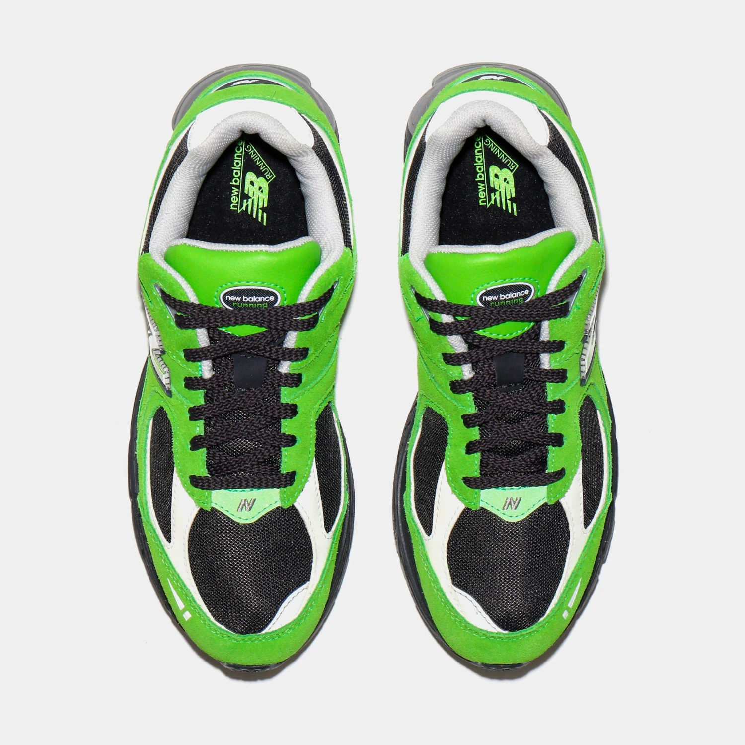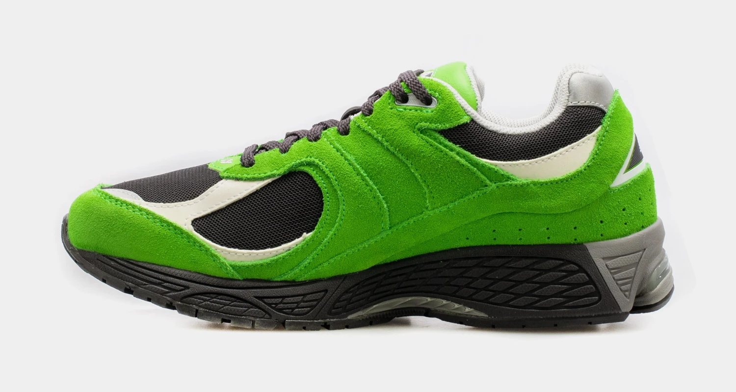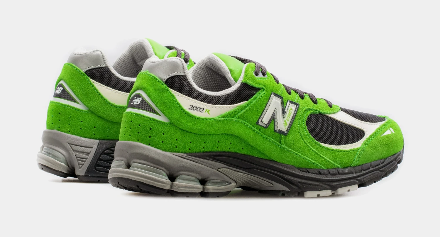 This offering of the New Balance 2002 features a Black mesh base with Green suede overlays. The โNโ logo also displays โN-ERGYโ in reference to the cushioning technology used on the modelโs midsoles. White synthetic on the toe box and ankle collar atop a Black rubber sole completes the design.