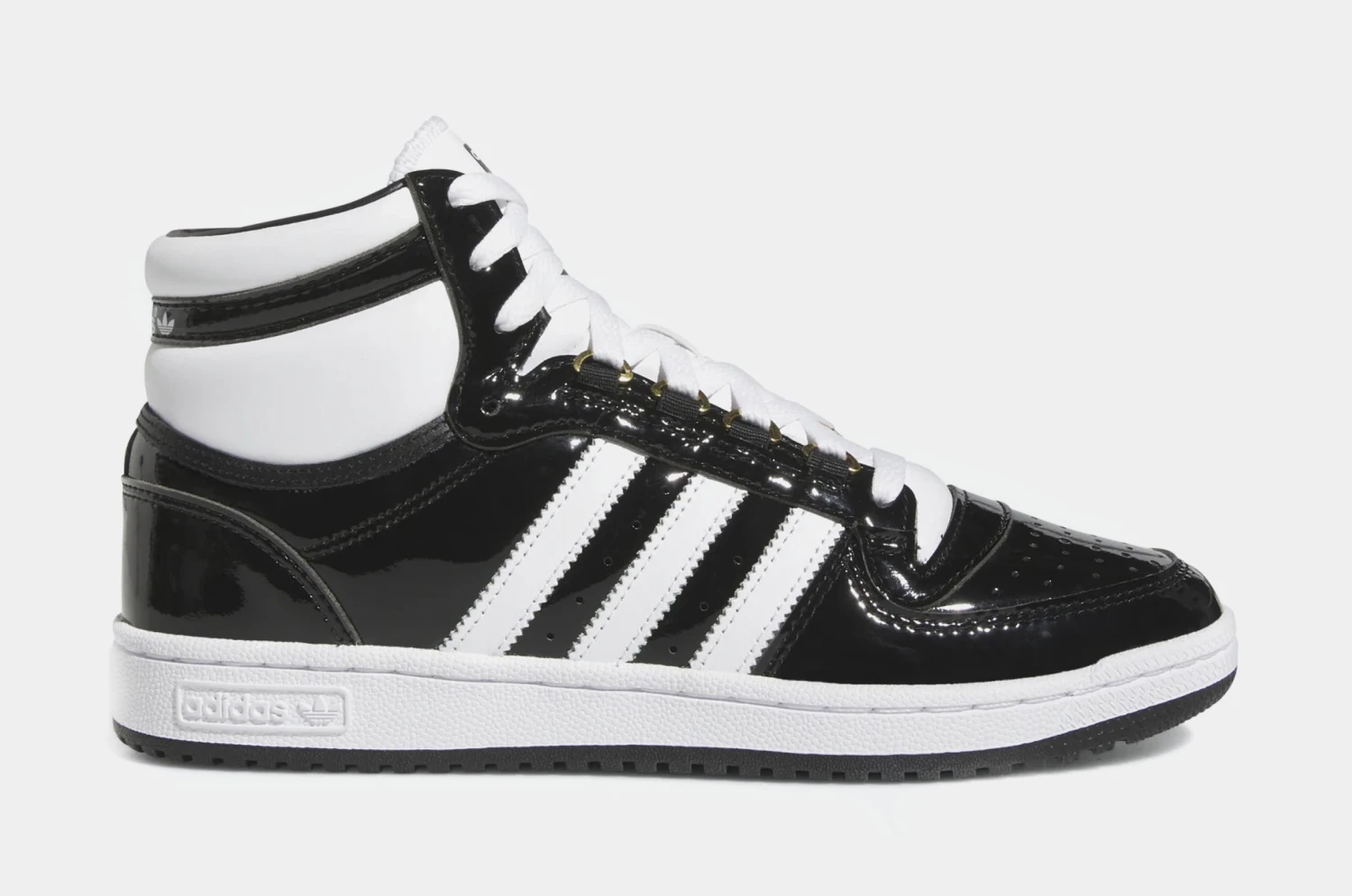 These adidas Top Ten RB Shoes offer a fresh perspective on the high top basketball shoe originally reserved for the best of the pro players. Celebrate that dynamic energy in show-stopping synthetic patent and an expressive design. Bold contrast colors frame the sleek silhouette. Metallic-gold eyelet rings add a stylish punch.