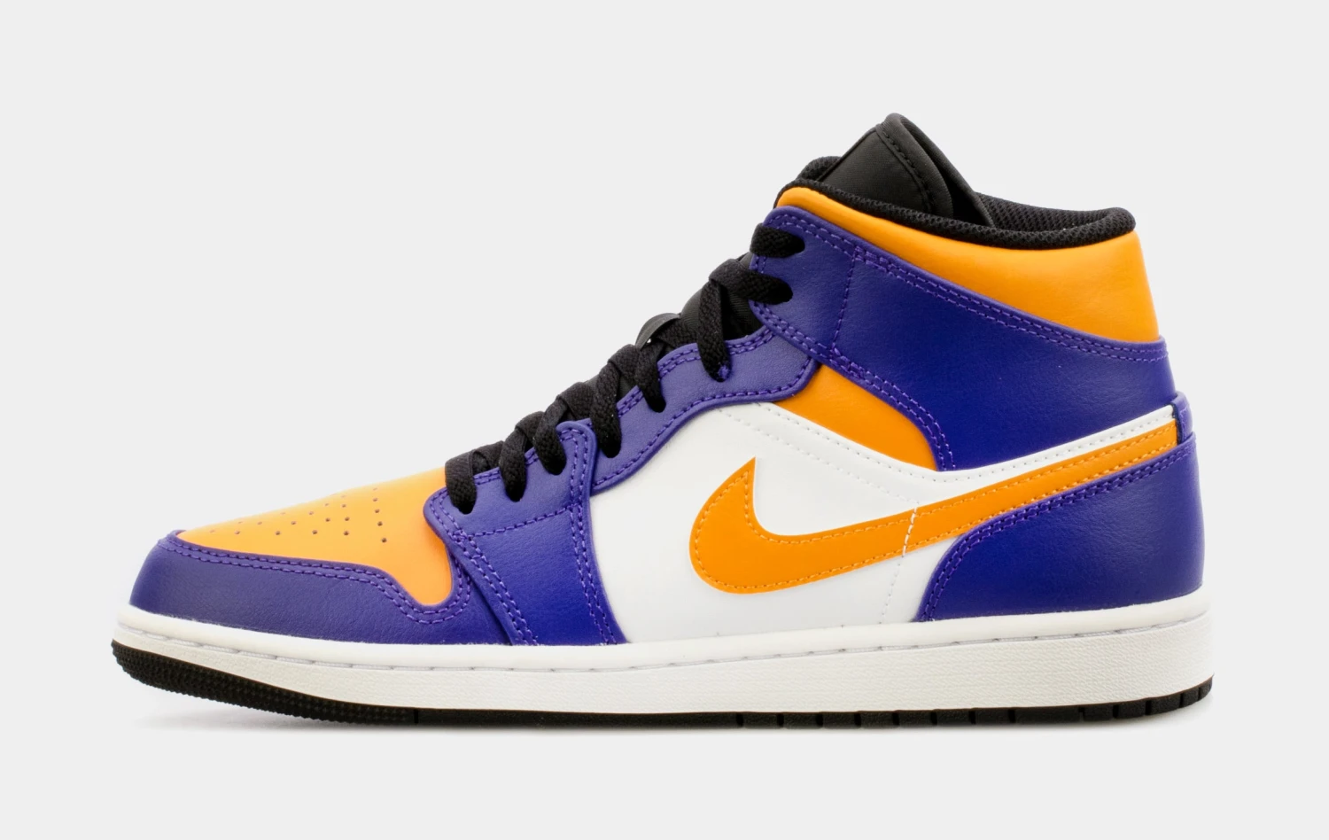 This offering of the Air Jordan 1 Mid comes constructed in a leather build featuring White side panels, Purple and Gold overlays, and Black mesh tongues. A White midsole atop a Black rubber outsole completes the design