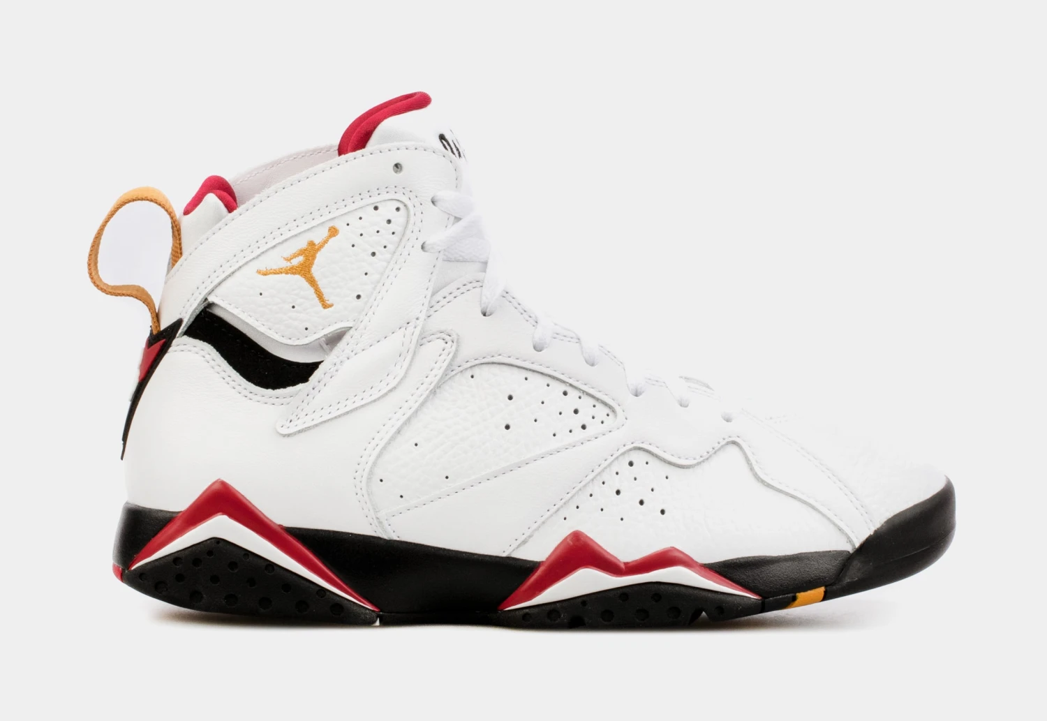 Dressed in a White,Black, Cardinal Red, and Chutney color scheme. This offering of the Air Jordan 7 will look just like the original pair featuring a White leather upper with perforations along the exterior paired with Cardinal Red and Black detailing throughout. A Gold embroidered Jumpman branding and heel tabs completes the design.