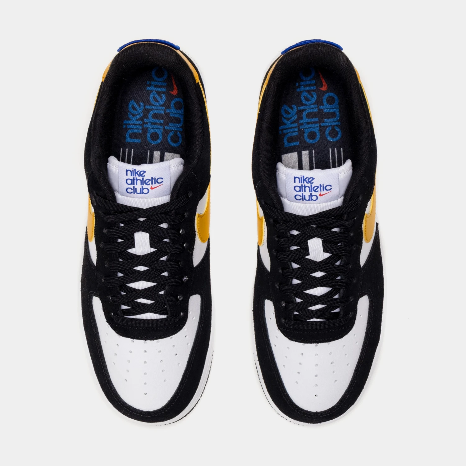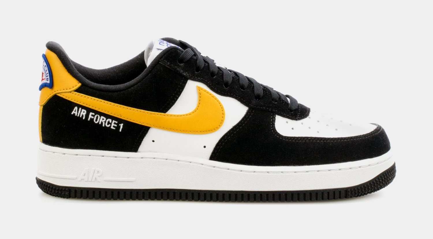This offering of the Nike Air Force 1 Low features a White leather base with Black suede overlays highlighted with University Gold leather Swooshes and heels. A retro-inspired Nike Athletic Club tongue tags and insoles with a special sew-on patch on the heels completes the design.