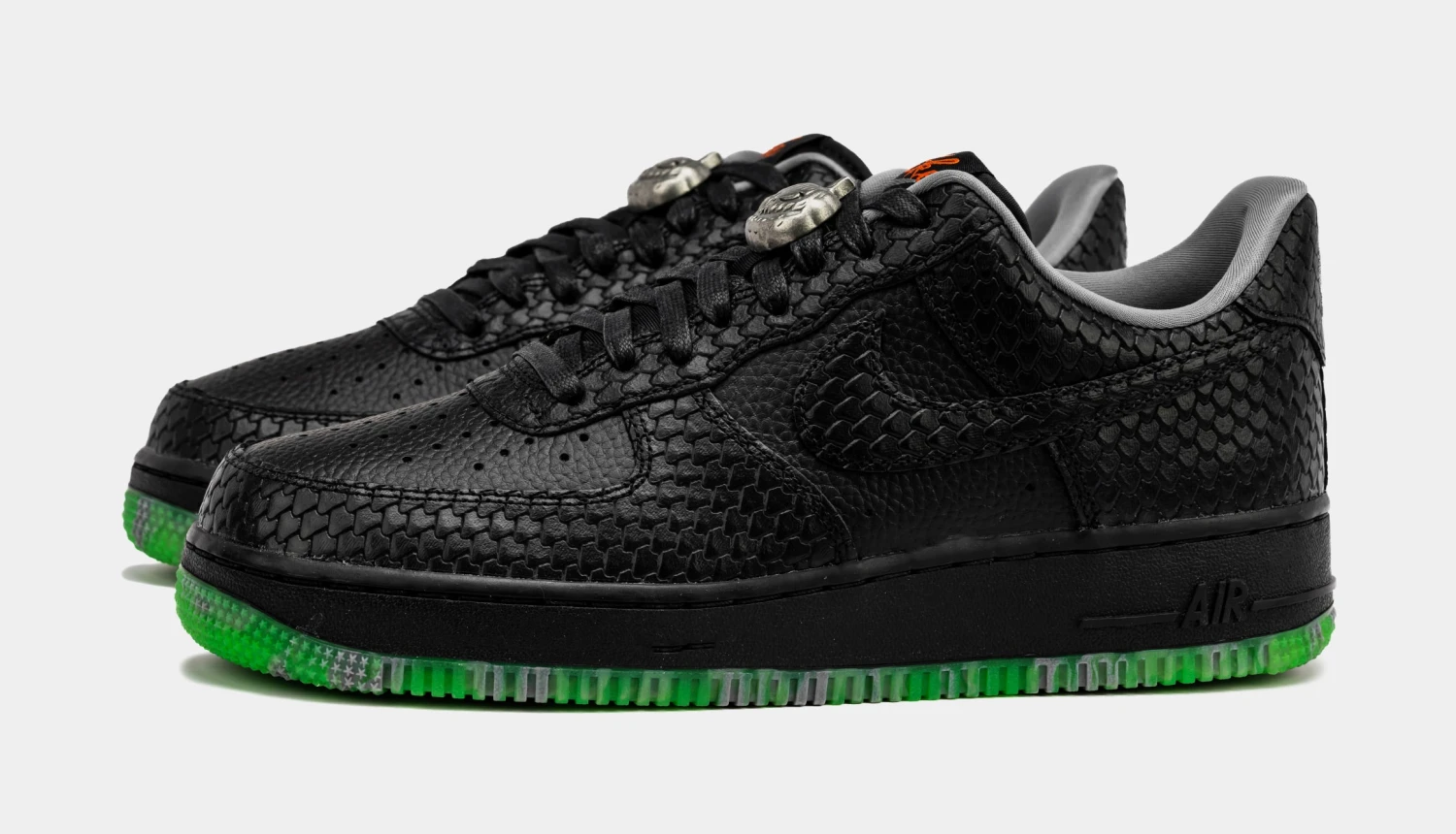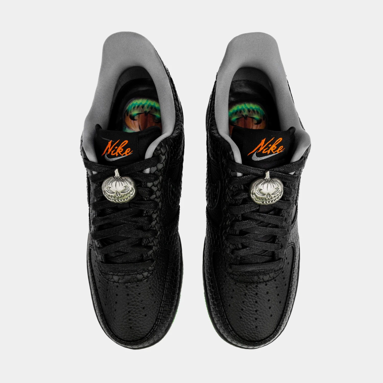 The shoe features a captivating all-Black upper made from a mix of tumbled leather and quarter panels with snakeskin details. The reptile eyestay, toe, heel, and Swoosh overlays add to the spooky vibes. But thatβs not all; Nike goes the extra mile to set the Halloween mood. The Orange cursive-branded tongue labels and Metallic Silver jack-o-lantern lace dubraes give the shoe a distinct and festive look. And wait until you see the insoles β they display a chilling forest with Swoosh-carved pumpkins, sending shivers down your spine.