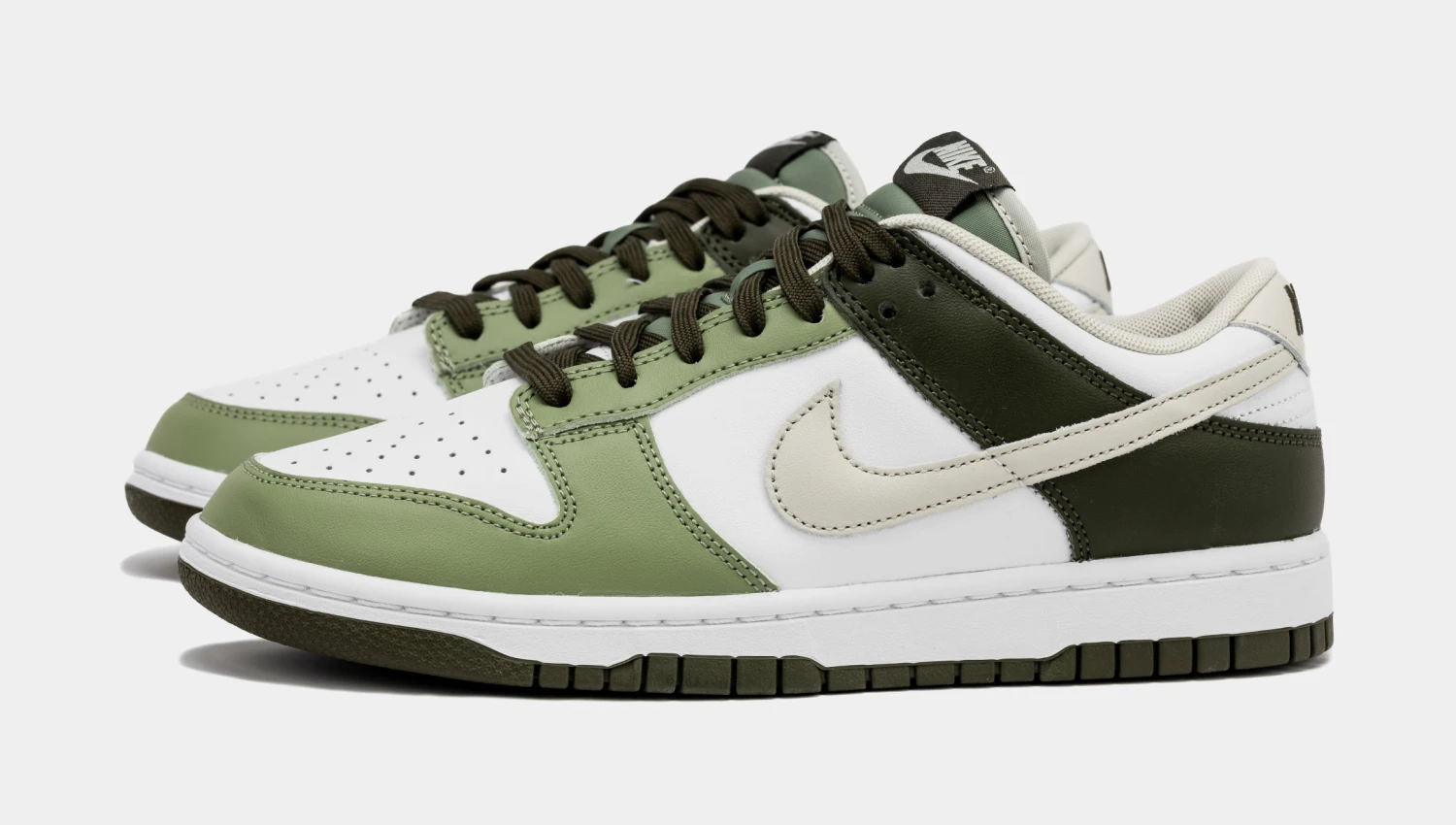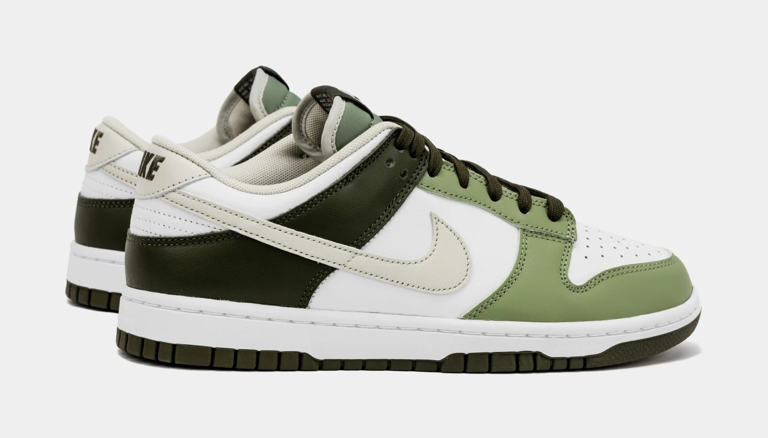 Dressed in a White, Light Bone, Oil Green, and Cargo Khaki color scheme. This offering of the Nike Dunk Low comes constructed in a full leather build with mesh tongues and lining. It features a White base with different shades of Olive used on the overlays, laces, tongues, tongue labels, insoles, “NIKE” embroider on the heels and rubber outsole. A Light Bone hue decorates the Swooshes, heel tabs, and inner lining all atop a White midsole to complete the design.